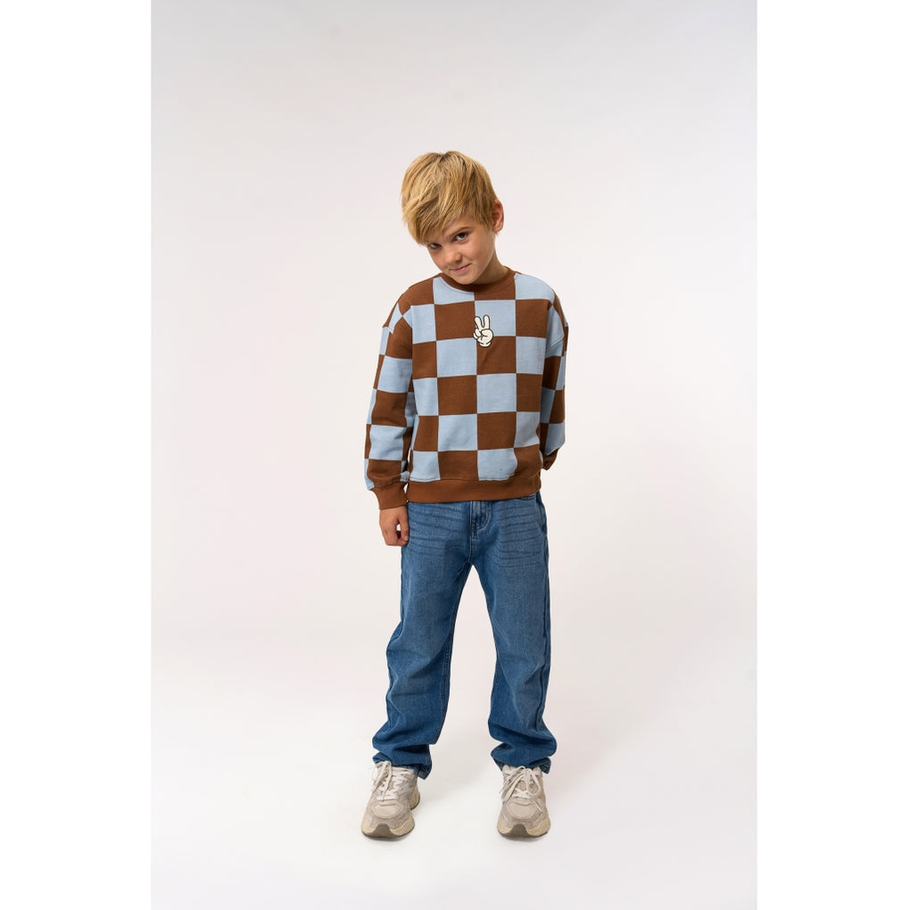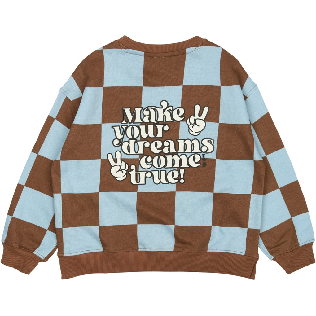 Sweat-shirt oversize THE NEW au design ludique et inspirant. Le devant est orné d'un signe de paix, tandis que le dos arbore le message encourageant « Réalisez vos rêves » accompagné de deux signes de paix. Le motif, un imprimé all-over unique (AOP) aux tons bleu clair et marron à carreaux, confère au sweat un look moderne et décontracté. Ce sweat-shirt est à la fois élégant et confortable, créant une ambiance décontractée et positive.